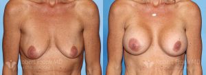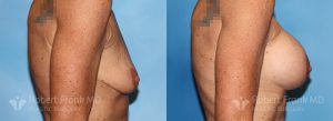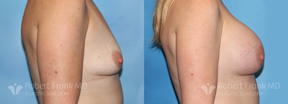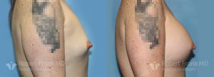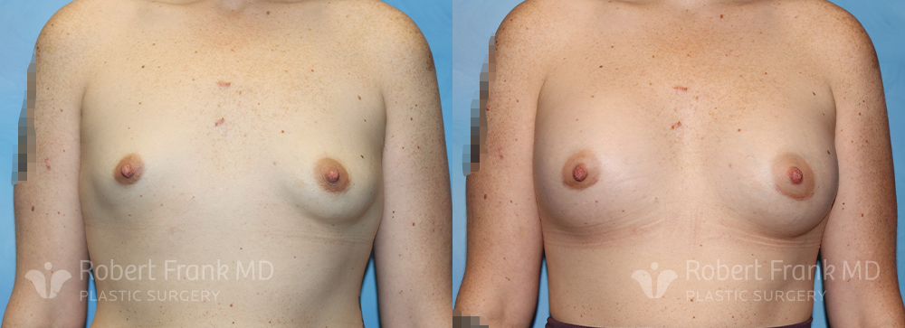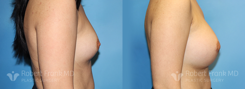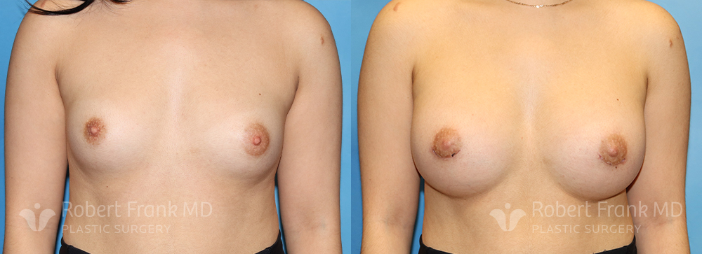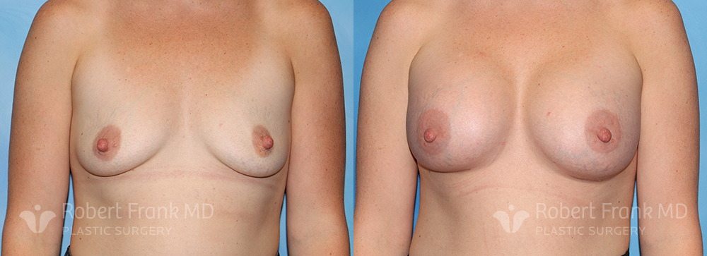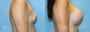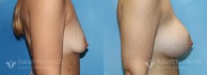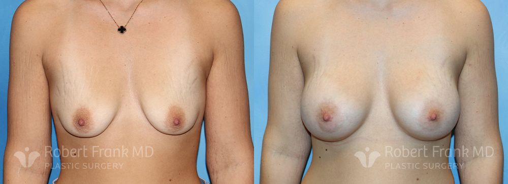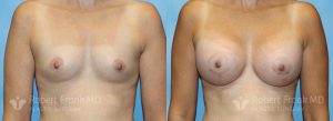 31 year old woman who has had two pregnancies and was unhappy with the appearance of her breasts. She was wearing a 34A bra and was interested in going to a C cup. The patient underwent sub-muscular augmentation via a periareolar incision using 375cc Mentor smooth round.